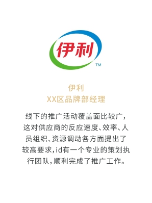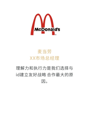i-d先后经历与Audi、Mercedes-Benz、infiniti、PORSCHE、可口可乐、麦当劳、肯德基、Budweiser、华为、小米、中国移动、ELLE、L'OREAL、万达、仁恒置地、恒大、碧桂园、兰桂坊...的业务合作,成功地将国际化的营销策划理念及执行方式融入本土,为更多的中国企业开启全新的品牌推广思路和执行方案。